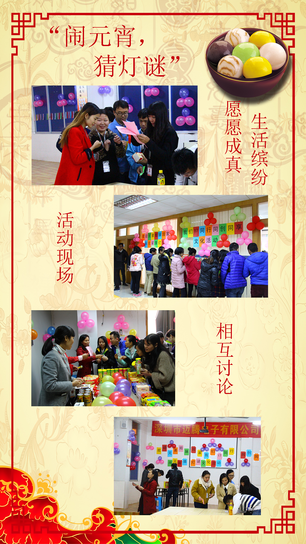 為營(yíng)造良好的節(jié)日氣氛,豐富公司員工的文化生活,同時(shí)為歡迎同事們節(jié)后返回工作崗位,在一年一度的元宵佳節(jié)即將來臨之際,公司特組織開展了“鬧元宵,猜燈謎”活動(dòng),活動(dòng)吸引了眾多員工的熱情參與。
