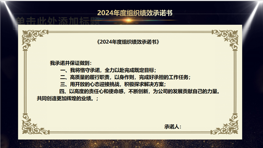 簽署績效指標(biāo)責(zé)任書是為了更好地明確任務(wù),強(qiáng)化責(zé)任。總經(jīng)理寄語全體同仁,要以高度的責(zé)任感和飽滿的熱情投入工作,共同為達(dá)成公司2024年度的戰(zhàn)略發(fā)展目標(biāo)而努力奮斗。